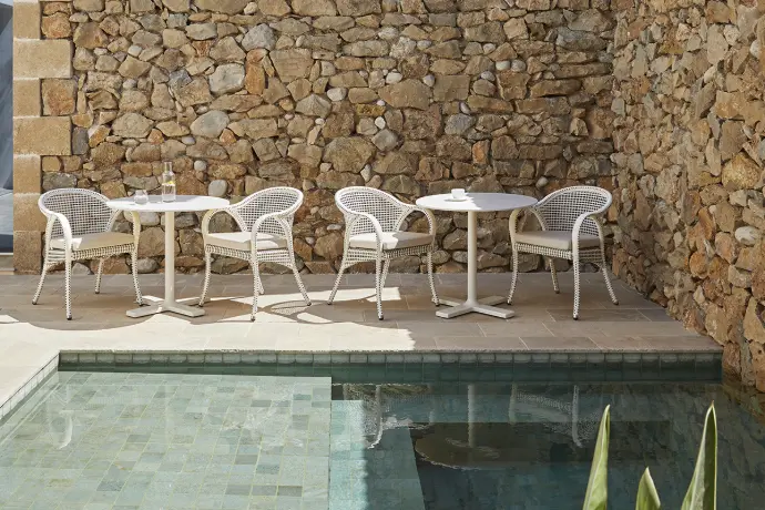 Tiene como punto de partida una revisión de la silla tradicional: universal, simple, funcional y atemporal, ahora vista desde el refinamiento, la precisión técnica y la sensualidad. «El efecto decorativo se produce aquí por la textura del trenzado, con el que se ha buscado rendir un homenaje a la artesanía. Por lo tanto, hay algo muy elaborado (hecho a mano), de diseño muy fuerte y muy simple». Explica su diseñador Christophe Pillet. La silla está realizada en aluminio combinado con cuerda y disponible en múltiples colores. Las mesas, en estructura de aluminio y tapa en porcelánico o compact. «Estamos ante una colección casi indefinida, clásica, universal, que definimos de manera muy ligera para aportar una nueva modernidad». Esta colección está compuesta por una silla, una butaca con brazos para el comedor y tres versiones de mesa.