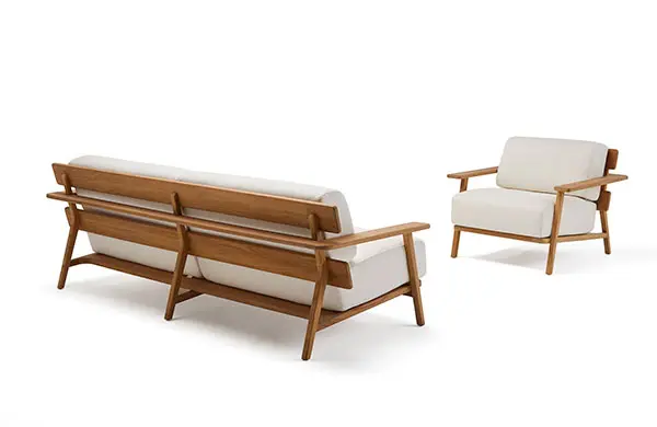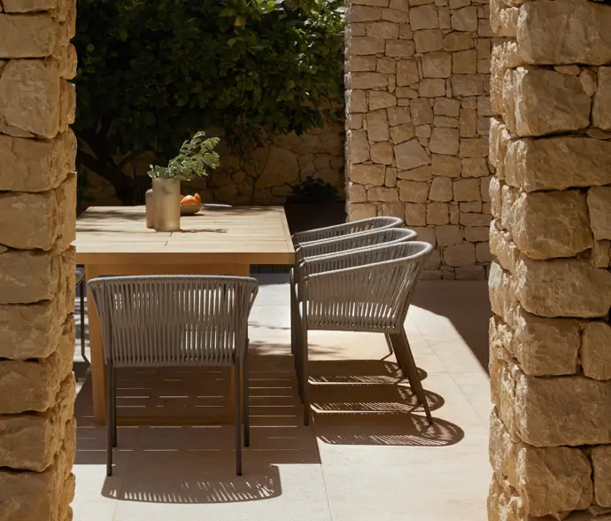 Diseñada por Gabriel Teixidó, para convertirse en un clásico. Como él mismo explica, «su elemento característico, la madera, es un material vivo que conecta bien con las personas y aporta calidez». Robustas y suaves a la vez, sus sillas, sillones, sofás, butacas y mesas combinan la teca de Indonesia (de bosques de tala controlada) y la cuerda sintética. Son un total de catorce piezas a las que se suman una tumbona, una mesita auxiliar y una mesa extensible. Pensadas para jardines, terrazas o porches, se integran con facilidad también en los interiores. «Es una colección humana que encaja perfectamente en ambientes naturales», señala Teixidó.