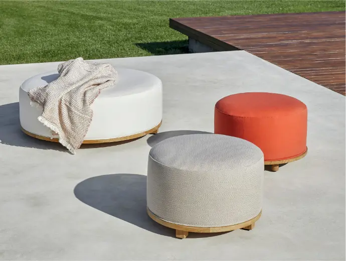 Siguen el principio geométrico de la filosofía de trabajo de Francesc Rifé y toman como eje la simplicidad del círculo y el equilibrio de la materia. El voluminoso cuerpo tapizado contrasta con una estrecha base de madera de teca, resistente y de la más alta calidad. Un diseño que encontramos disponible en dos tamaños y alturas, que funciona bien tanto en conjunto como en solitario.