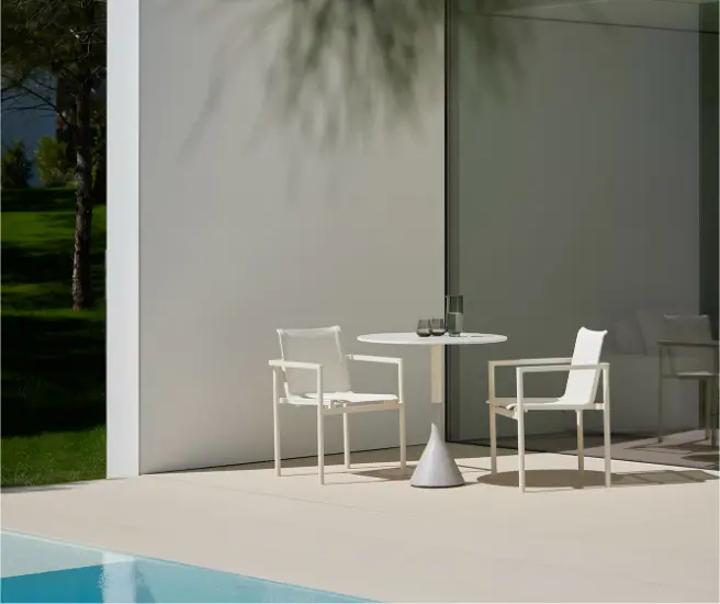 La colección Neck introduce el arte escultórico y el diseño funcional en el mobiliario de exterior. En colaboración con el galardonado estudio milanés, POINT presenta dos esculturales bases de mesa llamadas Neck. El punto de partida de esta colección fue la mesa bistro, que presentaba unos límites ergonómicos específicos. Se trata de una colección neutra y versátil pensada para cualquier espacio, especialmente los contextos contract y de exterior. La personalidad de Neck reside en su base, que aporta a la pieza un toque distintivo de forma discreta y sutil. Tres materiales diferentes interactúan en su diseño: la base es de hormigón, el cuerpo es de aluminio pintado en polvo y la superficie puede ser de teca, HPL o porcelánic