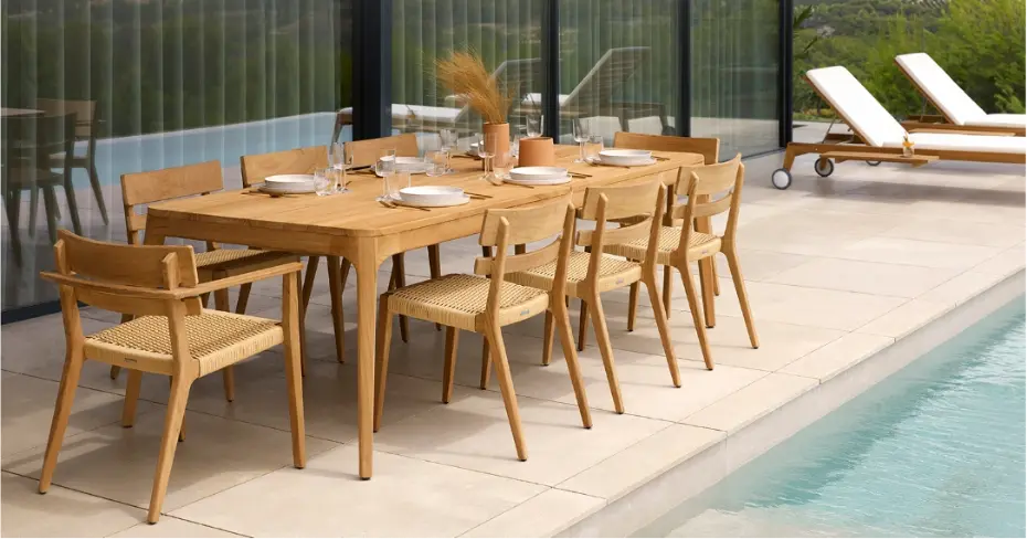 Una colección de diseño atemporal donde cada pieza cuenta una historia de carácter, autenticidad y elegancia contemporánea. Robustas pero refinadas, sus sillas, sillones, sofás y mesas están fabricados con madera de teca indonesia -procedente de bosques cuidadosamente gestionados y con certificación FSC- y cuerda sintética.