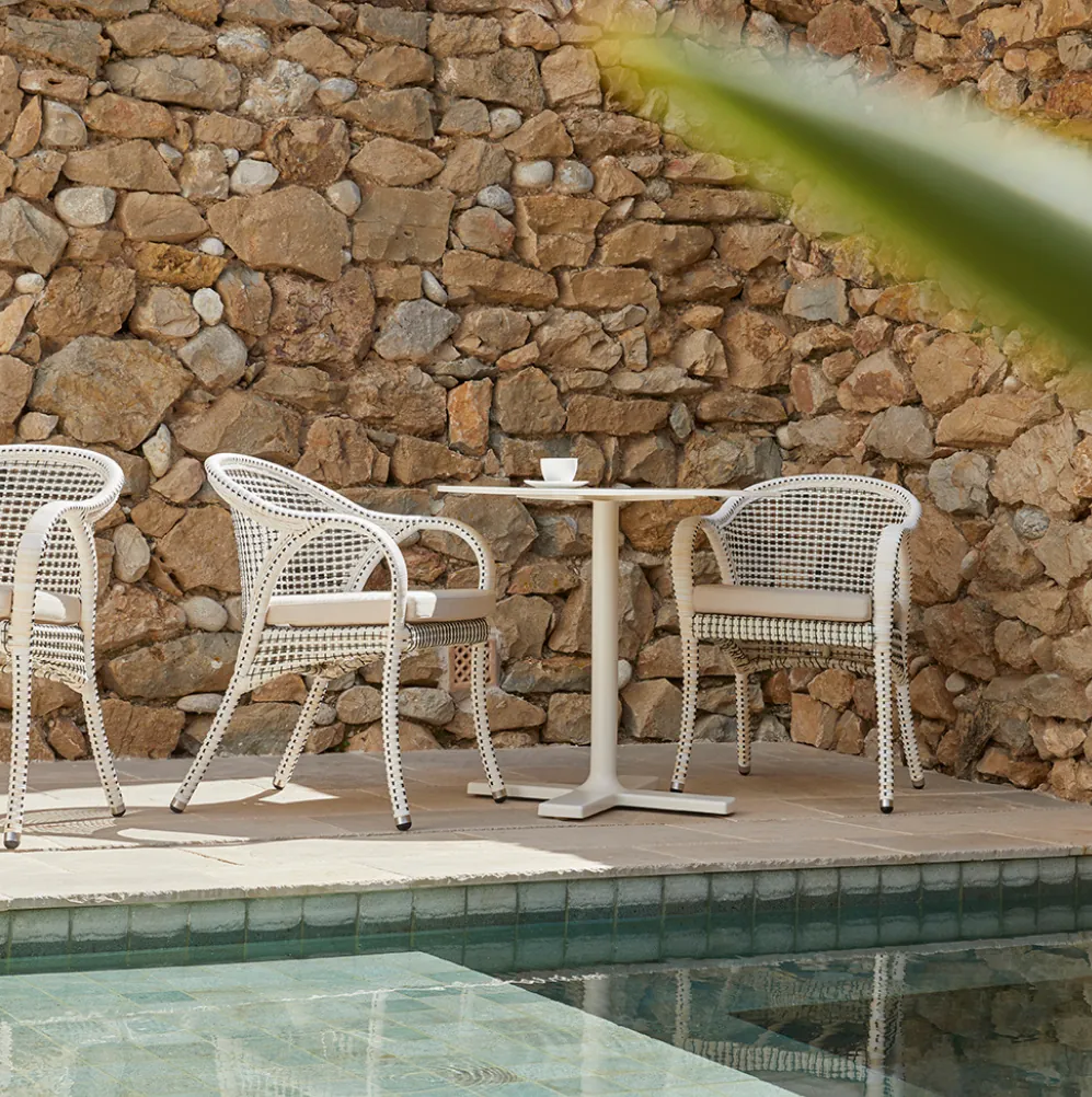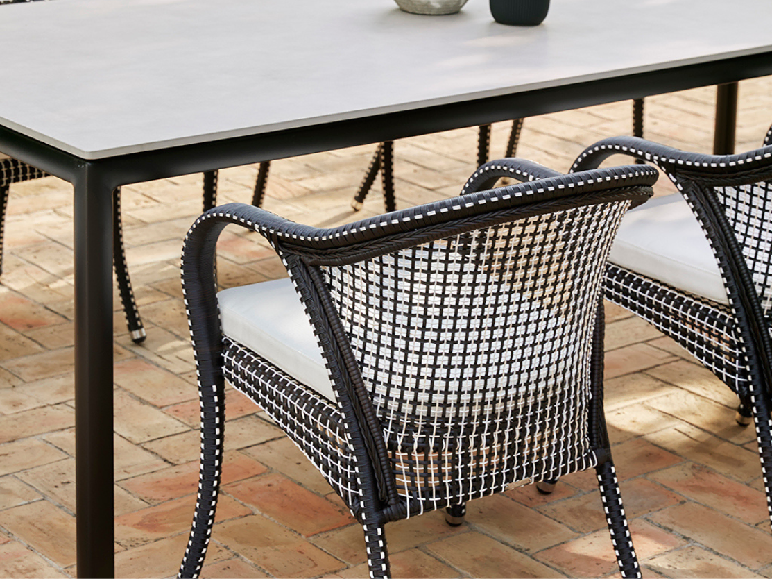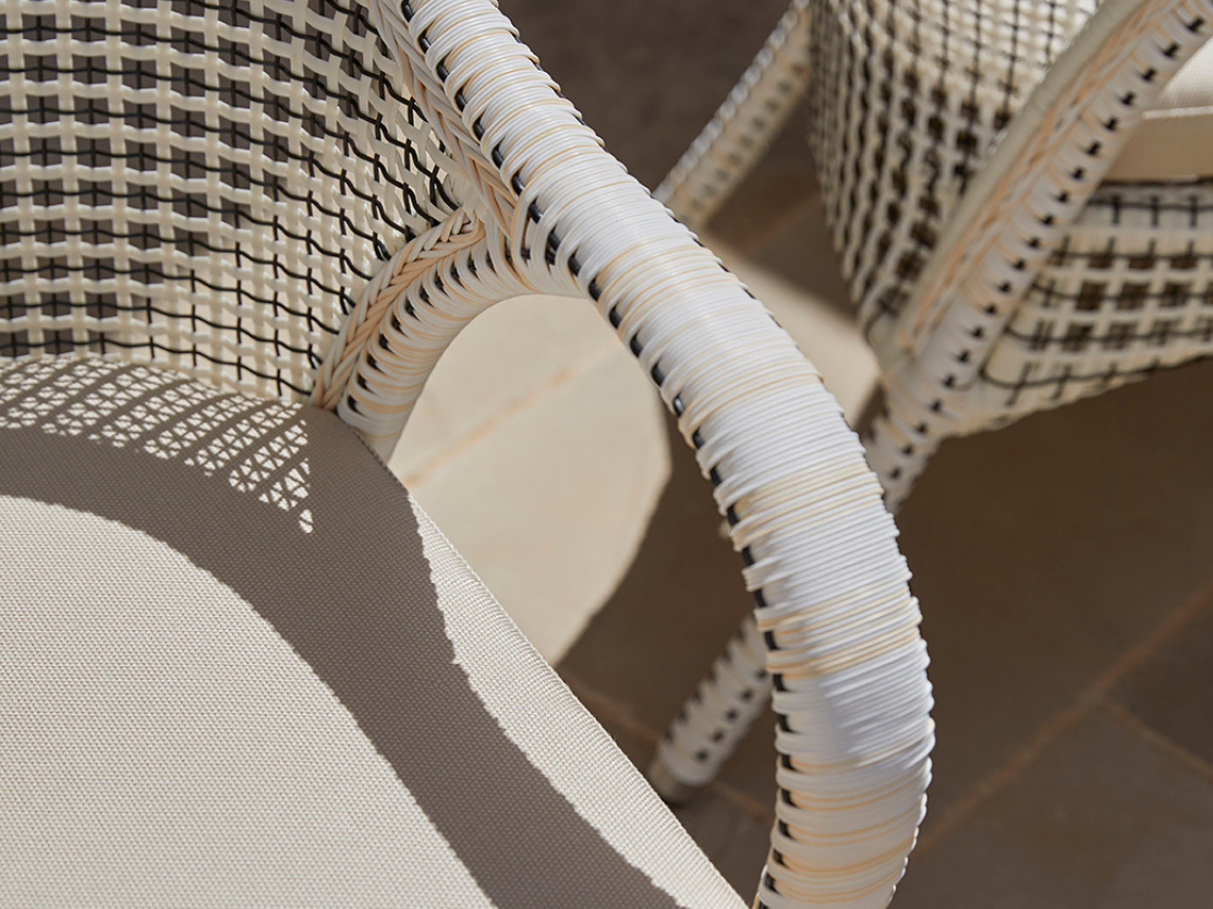 «El Caribe, las calles de Cuba, las tardes de ron, el relax y la calidez fueron la inspiración», explica Alfonso Gallego, diseñador del sillón de comedor Havana. El contraste es la clave de esta pieza fabricada con una estructura de aluminio lacado, recubierto con un trenzado en Shintotex –una fibra reciclable de alta resistencia desarrollada por POINT–. Las formas sinuosas de esta pieza están pensadas para acoger y, como en las mejores fotos, el blanco y negro toma protagonismo en el trenzado creando dibujos llenos de ritmo.