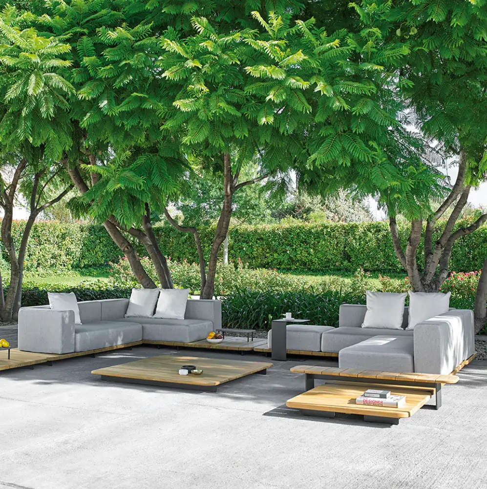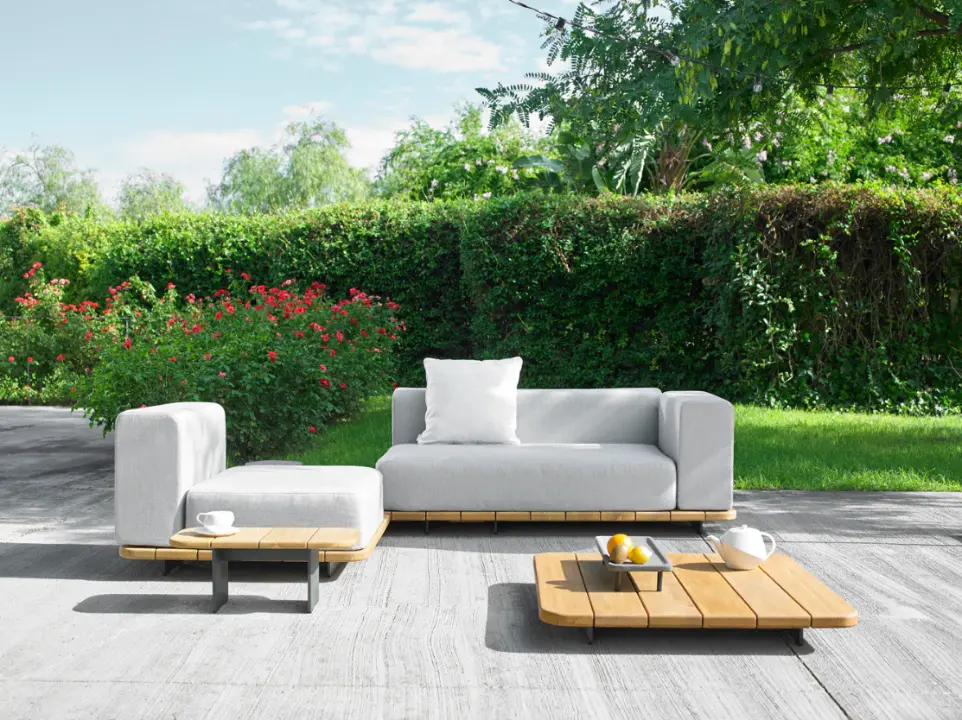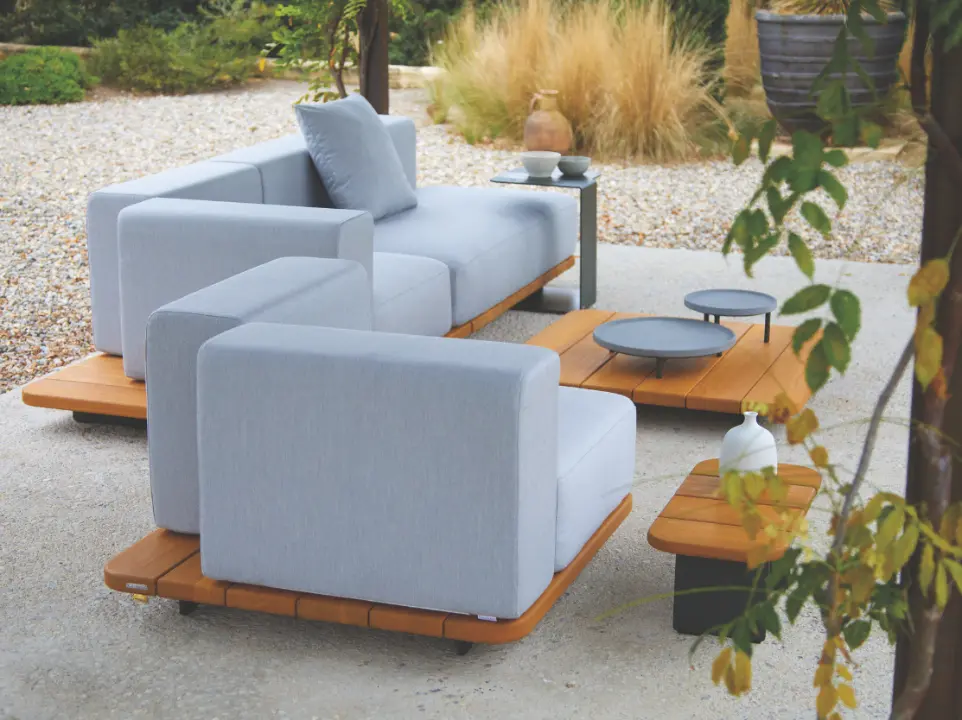 «La colección nace como una pieza arquitectónica compuesta por varios módulos que le permiten un sinfín de configuraciones», explica Francesc Rifé, diseñador de la colección. Pal se construye a partir de una base de madera maciza de teca sostenible, procedente de bosques de tala controlada, que funciona como una tarima ligeramente elevada del suelo gracias a unas patas regulables e invisibles. Sobre ella se sitúan los asientos y cojines. «El efecto resultante es el de un sinuoso bloque, casi flotante», añade Rifé. El sistema modular permite componer desde tumbonas hasta sofás o asientos individuales con una amplia variedad de tejidos impermeables y colores. La serie se completa con mesas de centro de diferentes dimensiones también en teca y con una mesa lateral que parte de la base del sofá.