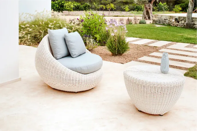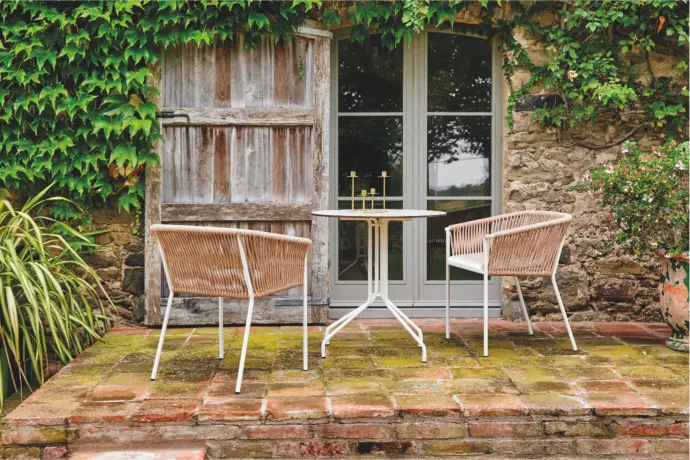 En la versión esencial de los espacios al aire libre, predominan los tonos claros y las texturas naturales. Colores como el blanco, el ocre, el rosa pálido y los marrones y naranjas suaves aportan su serenidad a la madera, las fibras naturales y a tejidos como el lino y el algodón. Todos estos elementos respiran naturaleza y dan forma a las piezas de mobiliario outdoor que visten estos espacios.