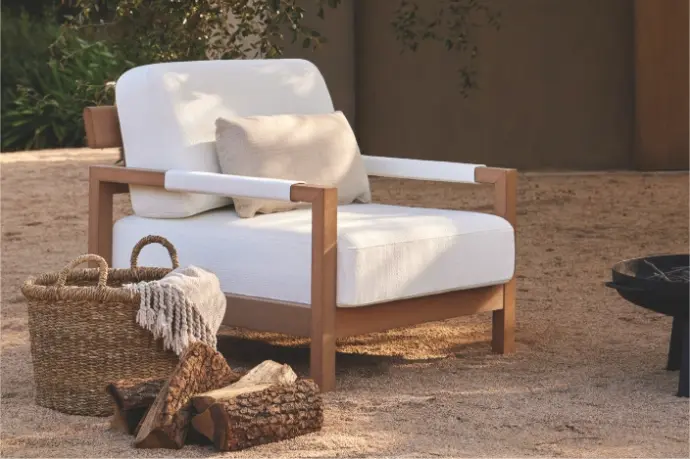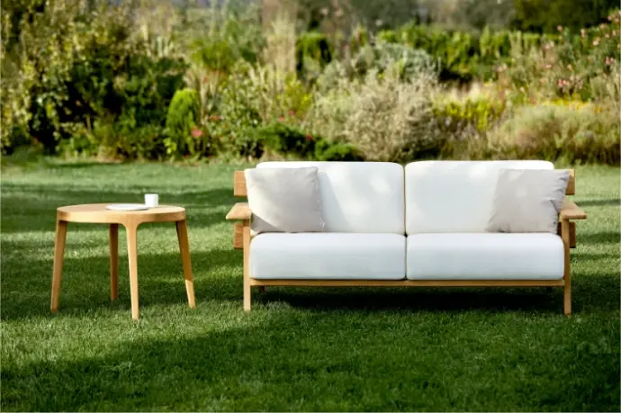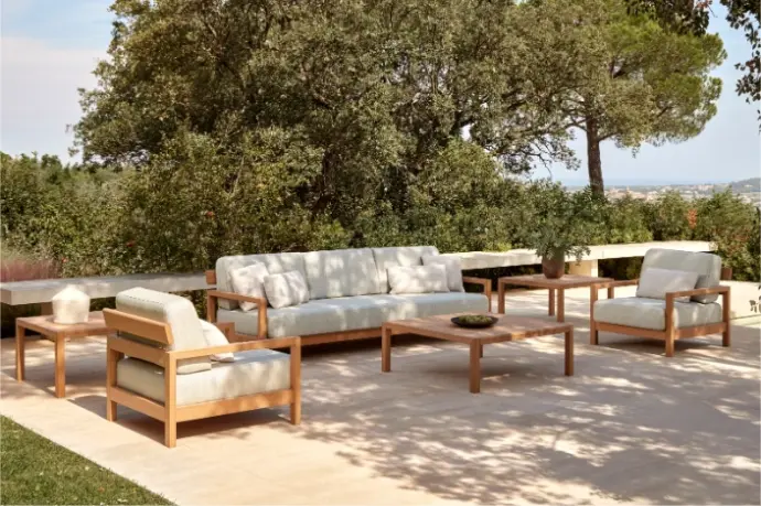 Diseñada por Gabriel Teixidó, para convertirse en un clásico. Como él mismo explica, “su elemento característico, la madera, es un material vivo que conecta bien con las personas y aporta calidez”. Robustas y suaves a la vez, sus sillas, sillones, sofás, butacas y mesas combinan la teca de Indonesia (de bosques de tala controlada) y la cuerda sintética. Son un total de catorce piezas a las que se suman una tumbona, una mesita auxiliar y una mesa extensible. Pensadas para jardines, terrazas o porches, se integran con facilidad también en los interiores. “Es una colección humana que encaja perfectamente en ambientes naturales”, señala Teixidó.