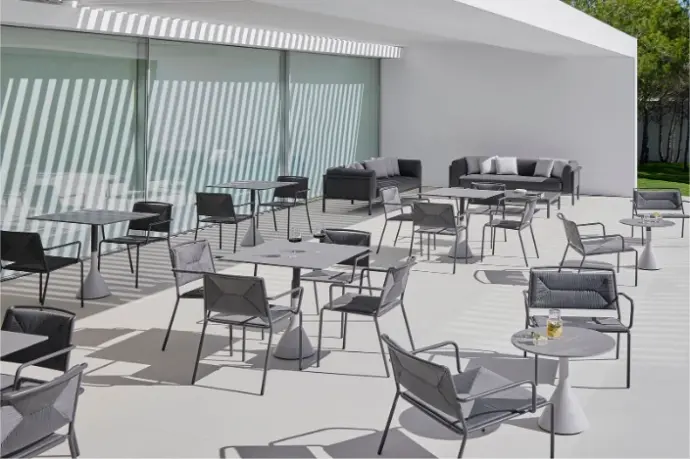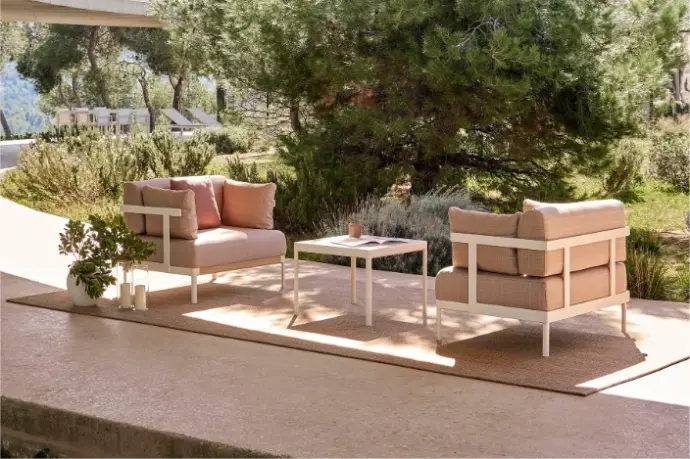 “Origin parece una colección sencilla y lo es, es lo que busca su diseño y lo pone en valor porque, pese a lo que pudiera parecer, lo sencillo y lo simple es lo más difícil de diseñar”, afirma Mario Ruiz. De inspiración minimalista, sus piezas están pensadas para durar e integrarse en cualquier ambiente. La colección está compuesta por mesas, sofás, tumbonas, butacas y sillas, todas apilables. La estructura de los elementos es de aluminio pintado en polvo, material escogido por su durabilidad y por ser 100% reciclable al final de su vida útil, lo que apoya el compromiso con la sostenibilidad de POINT.