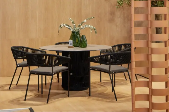 Since it was launched in 2017, this collection with its soft, relaxed lines has reaped many international awards, such as the International Interior Design Association’s 2018 Global Excellence Awards, Gold Medal in the Ibero-American Biennial CIDI for Interior, Design and Landscape and the ADCV GOLD Award for Outdoor Furniture in 2017. Inspired by the way baya weaver birds weave their nests, Vicent Martínez designed this collection to be as functional as it is emotional. Meticulously finished, each piece is created by hand, woven strand by strand. It consists of a total of twenty-seven elements, including swings, tables, sun loungers, sofas and chairs, all with a structure that envelops, protects and relaxes. The latest additions to the collection are a dining armchair, a base for dining tables and a versatile rope table base –round or square– that can also be used as a planter or a pouffe. All the pieces have a powder painted aluminium structure and the characteristic rope weave. There are a great variety of possible combinations thanks to their finishes in taupe, cream and black.