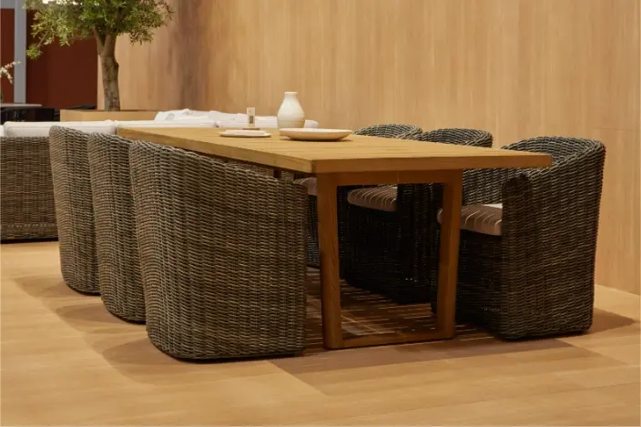 Designed by Gabriel Teixidó, it is set to become a classic. As its creator himself explains, “its characteristic element, wood, is a living element that connects well with people and gives it warmth”. Robust yet soft, its chairs, armchairs, sofas and tables combine Indonesian teak wood (from carefully managed forests) and synthetic rope. There are a total of fourteen pieces, also including a sun lounger, a side table and an extendible table. They are designed for gardens, terraces or porches, integrating easily into indoor spaces too. “It’s a human collection that fits perfectly into natural surroundings”, says Teixidó.