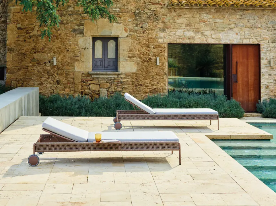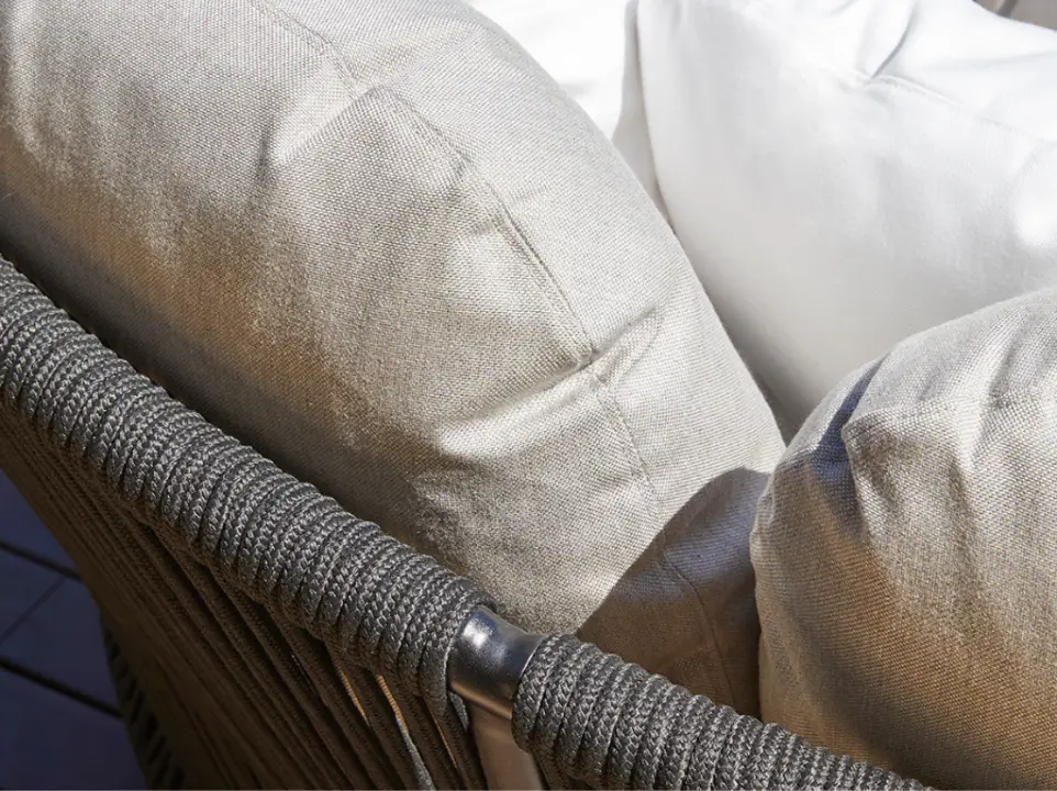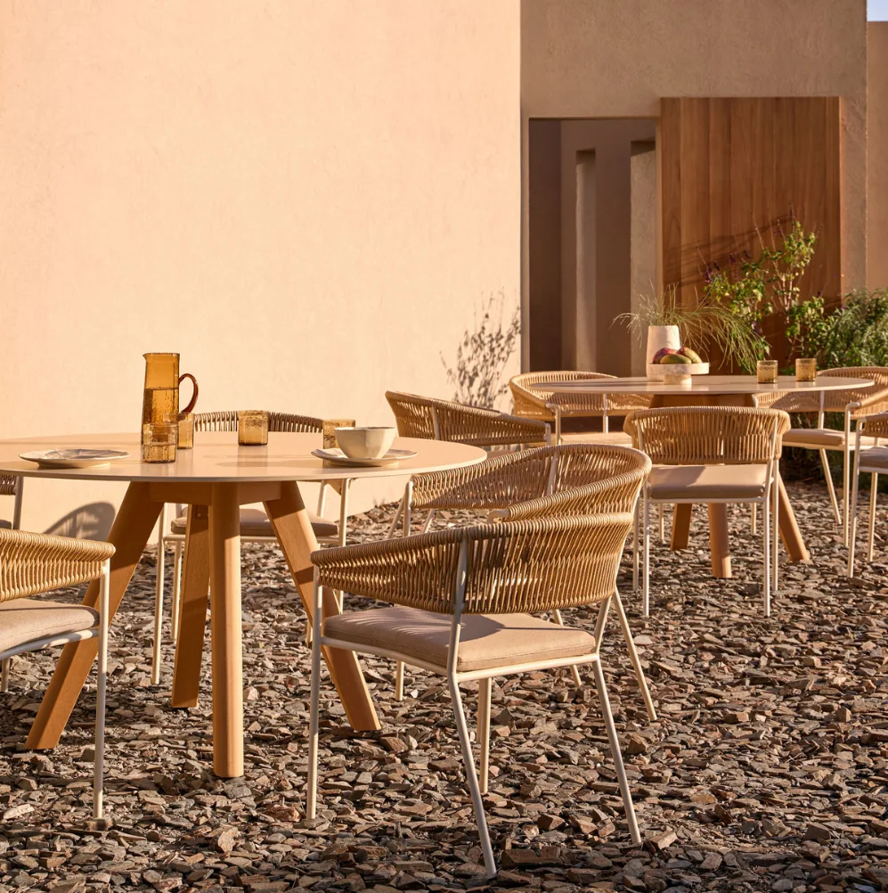Inspired by the knotting of baya weaver birds' nests, Vicent Martínez designed this collection to be as functional as it is emotional. Meticulously finished, each piece is created by hand, knotting fiber by fiber. It consists of a total of twenty-seven elements; the latest additions to the collection are a dining chair, a round rope table base, and a versatile planter that can also be used as a pouf or table. All pieces have a powder-coated aluminum structure and the characteristic rope weave.