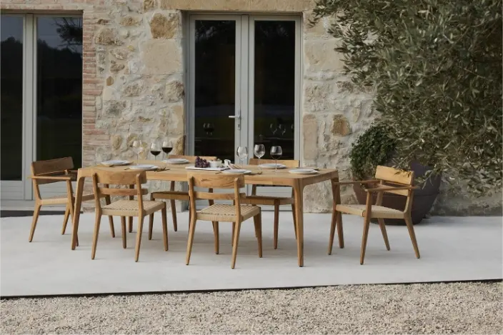 El nombre de Paralel se inspira en su propia estructura y silueta. La colección halla su personalidad distintiva en la madera de teca, una madera perfecta para los espacios exteriores. Paralel nace de una estructura de teka de largos brazos paralelos que acoge de forma equilibrada y elegante el respaldo y el asiento del mueble. Su diseño está concebido para ser bello desde cualquier ángulo.
